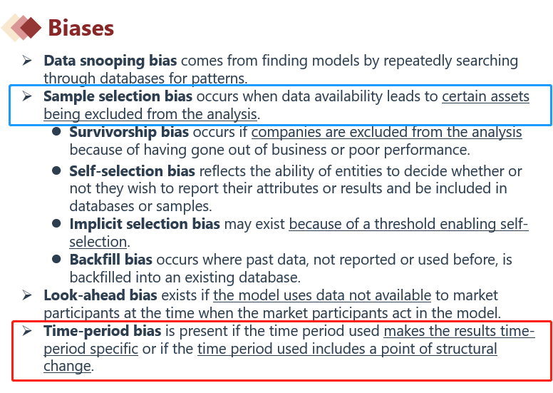 题目问的是“Time-period bias”,它的特点是数据中包含了结构性变化,例如样本包含10年数据,前五年“闭关锁国”经济发展较慢,后五年“开发国门”交际较快,此时的10年数据得出的结论不可准确预测未来经济走势