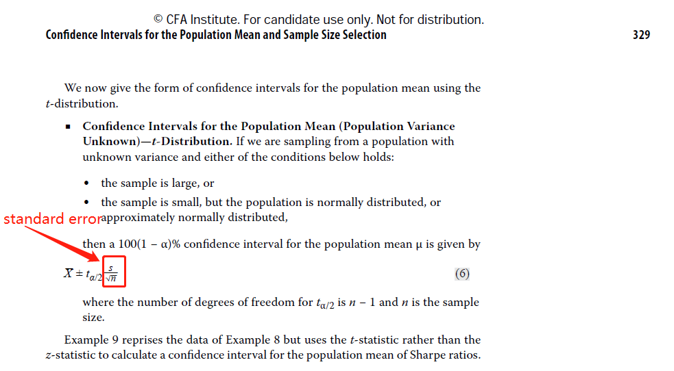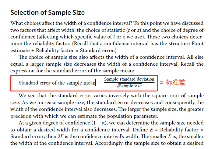 standard error标准误的本质是一个标准差(红色箭头),是构建置信区间(P329截图公式)的一部分,当标准差降低,置信区间的宽度减小,置信区间变窄