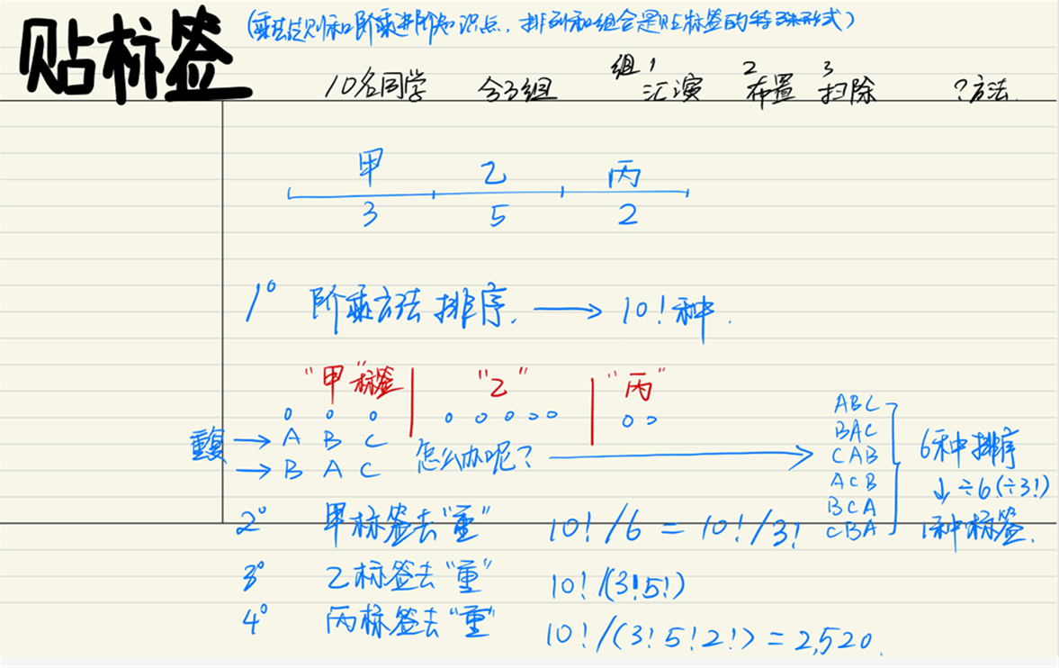 课上讲的“排列和组合”都是贴标签的特殊形式,排列计次序,组合不计次序(过程如下,其中甲乙丙每组人数是我自己编的数字)