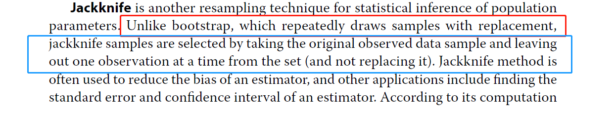 在resampling的方法中,bootstrap是放回式抽样,jackknife是不放回式抽样