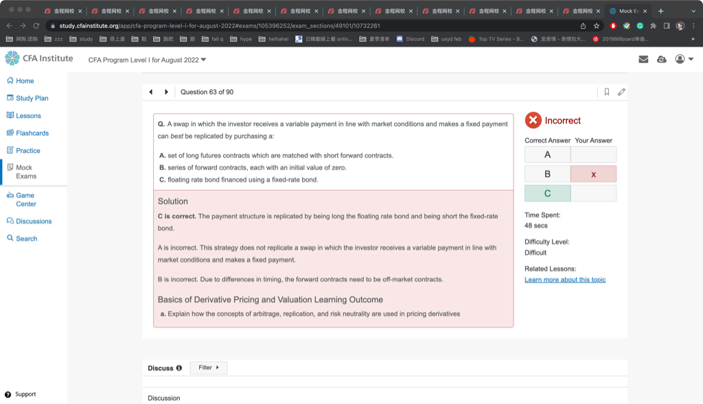 而多个Forward在期初可以合成Swap的效果,如附图,此时多个Forward他们每一个并不是Valuation=0,但合成的swap效果是valuation=0。如果假设forward对应支固定收浮动中的fixed payer一方,意味着未来多个时间点支付固定现金流,而多笔支付固定现金流合成的效果是:期初支付固定现金流等于收到浮动现金流,这样现值"支付"和现值"收到"平了,理解是有点难,因为是二级的内容,需要结合板书理解,换一句话说,多个Forward在期初等价于收到浮动现金流,所以单个off-market forward的valuation不等于0,合成Swap的valuaiton等于0