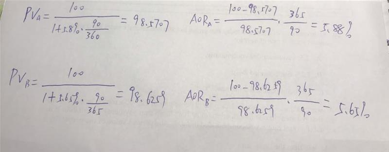 1.我没明白 day convention那一列有写discout 有写AOY的意思是什么,是作为计算ABC三个的PV时来参考是用360还是365么? 2.算出PV后,算三个值的AOY,是均用365计算还是仍然是参考basis里给的信息来算?3.不管用360还是365,试了多次也没有算出instrument A值答案里的5.9671%,问题出在哪里?谢谢。