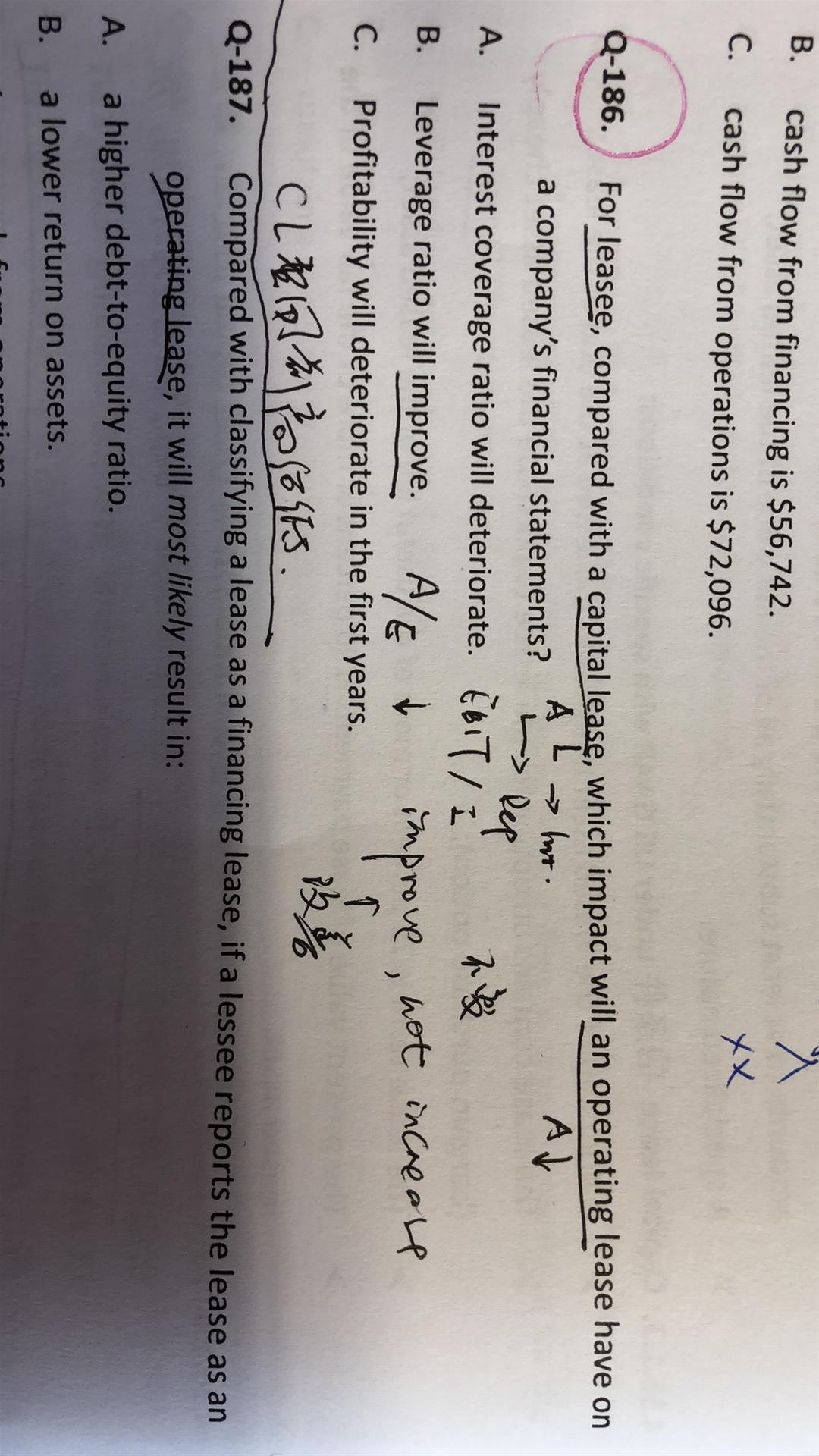 同学你好,operating lease不记录interest expense,不确认资产和负债,意味着operating lease的长期偿债能力是高的,因此interest coverage ratio应当是更好了的,而不是更差。