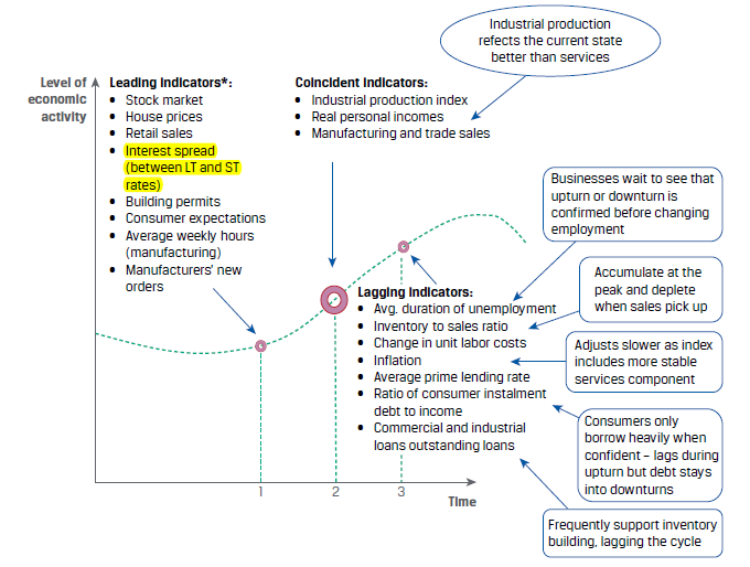 所以LT-ST变大,你可想成是LT变大,而LT的上涨反映的是人们预期未来短期利率会上涨,意味着预期之后经济会增长;或者理解为当前隔夜利率下降,因为央行要使用宽松财政政策刺激经济,之后经济会好转。这些思路都可以帮助你去理解为什么LT-ST变大就预示着经济好转,而LT-ST变小就预示着经济下行