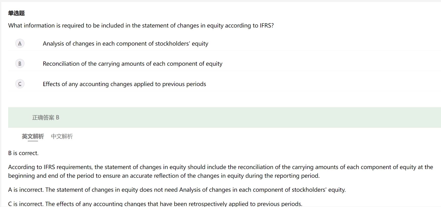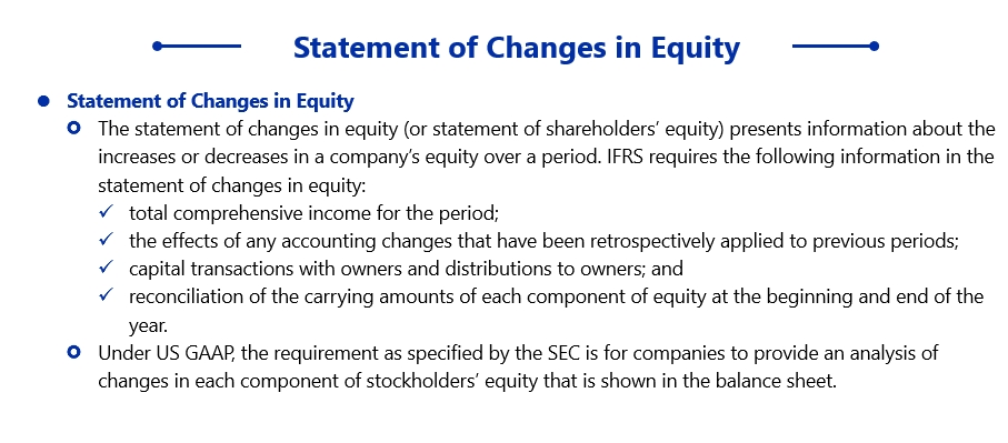 根据国际财务报告准则的要求,股东权益变动表应包括资产各组成部分的账面价值在期初和期末之间的调解(reconciliation),以确保准确反映报告期间股东权益的变动。