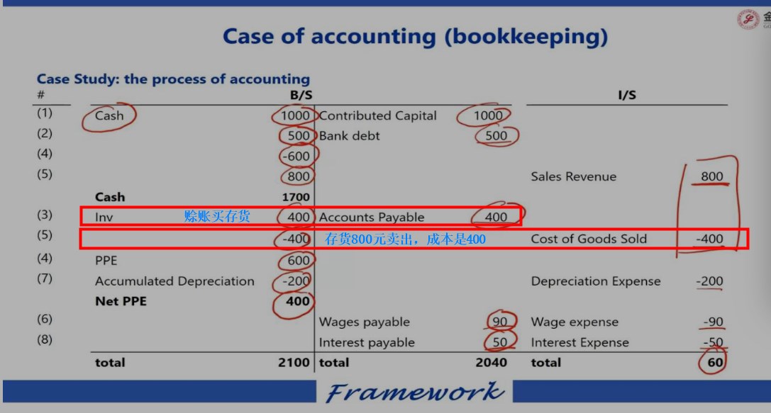 2. 卖出存货,存货不在公司账上,所以inventory减少400。同时利润表里要记录这笔交易,其中虽然存货卖了800元,但是我自己进价都是400块,所以有400是卖出货物的成本,COGS增加400