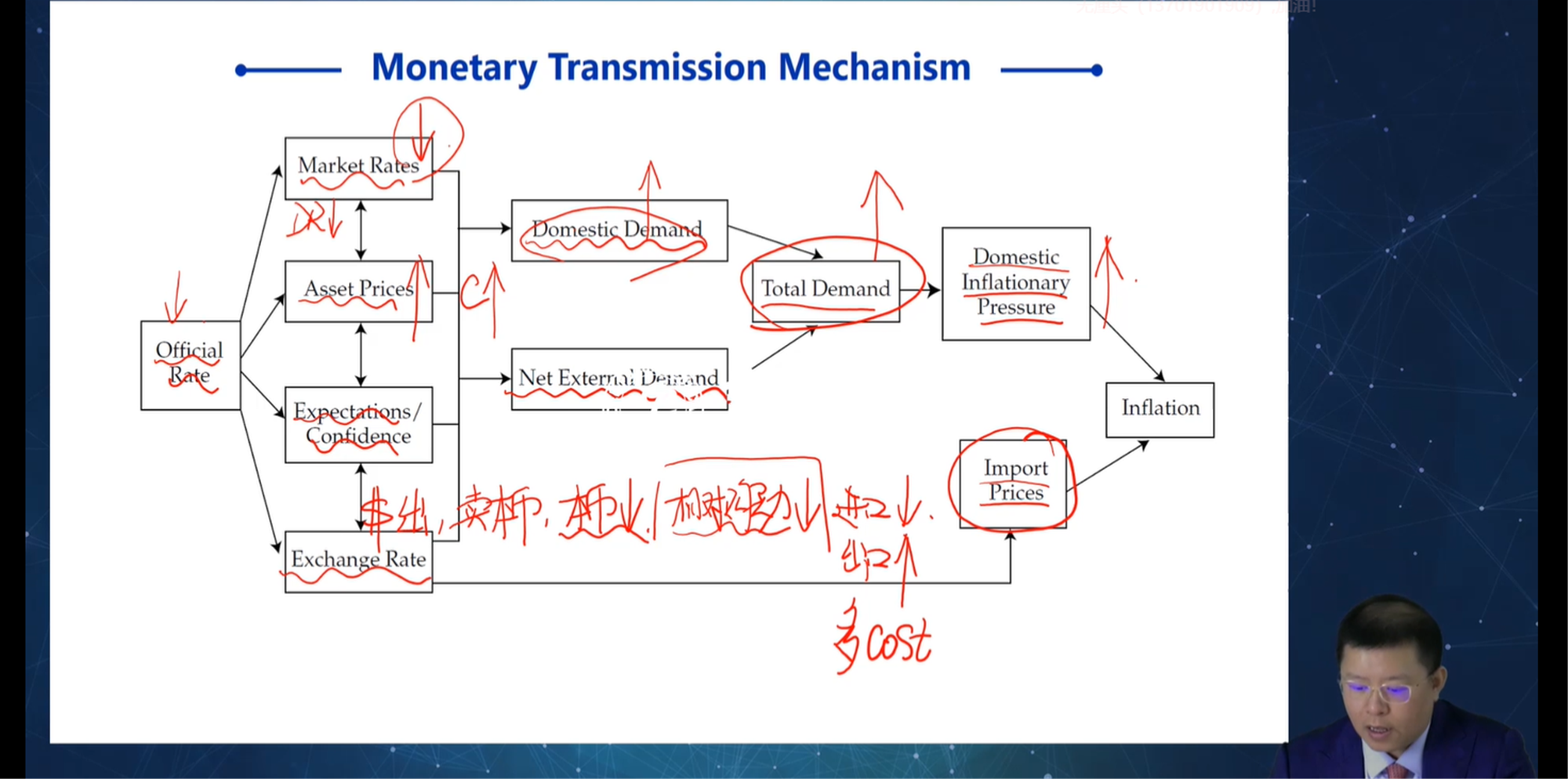https://www.gfedu.cn/squareques/id_855590.html,2023书-Module 5-Example 8, 1.C选项中的expectations about future interest rates对应的是Exhibit 7 货币传导机制中的哪一个?2. 请讲解一下Exhibit 7 货币传导机制中的Official policy rate下降之后,其余内容 market rates, asset prices, expectations/confidence, exchange rate, domestic demand......分别是怎么跟着变动的?为什么是上升的,为什么是下降的?或者有没有讲解视频,请提供链接