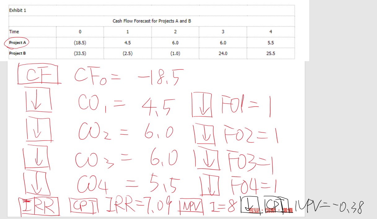 请参考以下截图,以项目A为例计算IRR和NPV(题目给的计算NPV的折现率为8%)