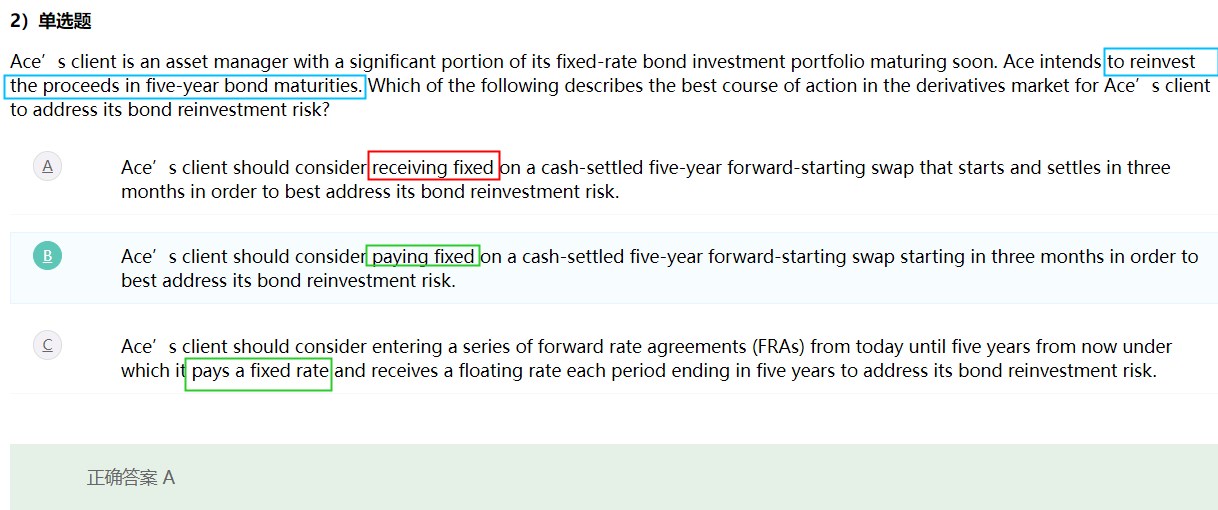 请参考以下截图,题目说了未来需要投资coupon,那么担心的事情是未来投资利率下降导致投资收益率降低,于是签订的衍生品应该是收到固定的现金流,规避掉不确定的投资收益,而B和C都是支固定所以不选