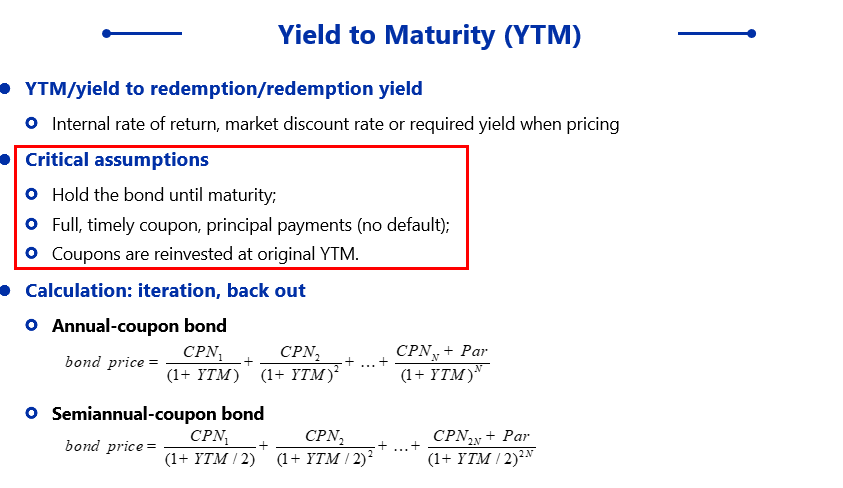 YTM严格意义上来说是到期收益率,它不变是要有假设的,符合假设那么YTM值就不变,见下图讲义。