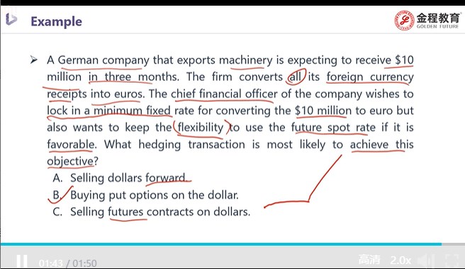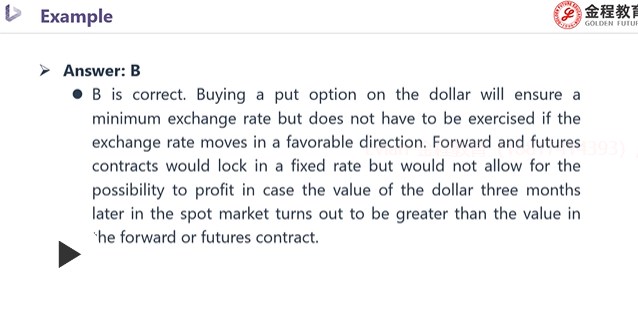 而题目又说了在美元上涨的时候,依旧可以享受这种优势(卖掉美元,换回来更多欧元),于是选择看跌期权,当标的资产价格(美元)下跌时,看跌期权会行权相当于是一份保险,而当标的资产价格(美元)时,这份看跌期权不行权不起作用。