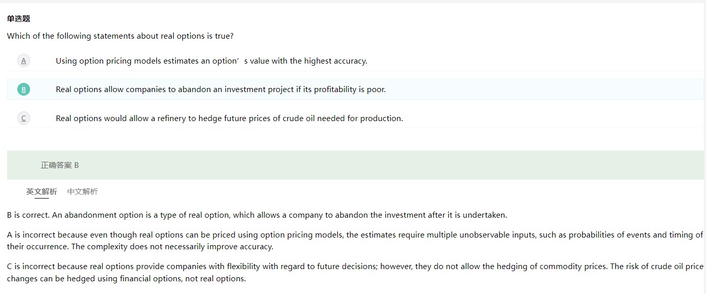 B 实物期权允许公司在盈利能力较差的情况下放弃这个不赚钱的项目。(选择B)