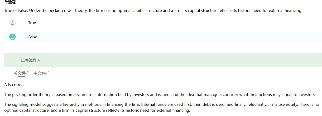 Pecking order强调的是融资的顺序或者是等级,它没有明确最优资本结构(定性的融资权重或者占比,例如pecking order是不会确定以下定量的信息:一家公司的内部融资10%,股权融资30%,债务融资60%)