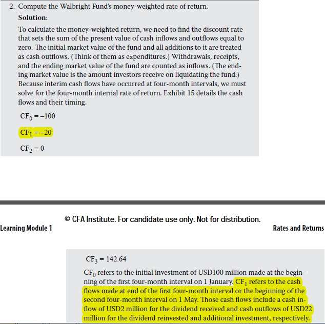 Module 1-书P27-Example 10-1. Solution 1-Rtw的计算公式为什么=1.12*1.0806-1,而不是[(1.12*1.0806)^0.5]-1?另外,金程中文版(上)关于HPR有两个公式,什么时候用截图2的公式,不开根号,什么情况下用截图3标黄的公式以及截图3“举个例子”里的公式应用,需要开根号再减1?截图1的Example 10-写的是(注:仅当1.12和1.0806分别适用于一整年时,取乘积1.12 × 1.0806的平方根才是合适的。),截图2里也是一年一度的年持有收益率,但是却没有开根号?2. 截图2和截图3里用的都是一年一度的年持有收益率,为什么截图2没有开根号,但是截图3却开根号了?3. Solution 2-CF1里,为什么没有考虑capital gain 10 million? 4. Solution 3, 从题干中的哪个信息,可以得出“Walbright基金在这8个月期间的表现相对较差”的结论?Solution 4的答案不是很理解,请解析
