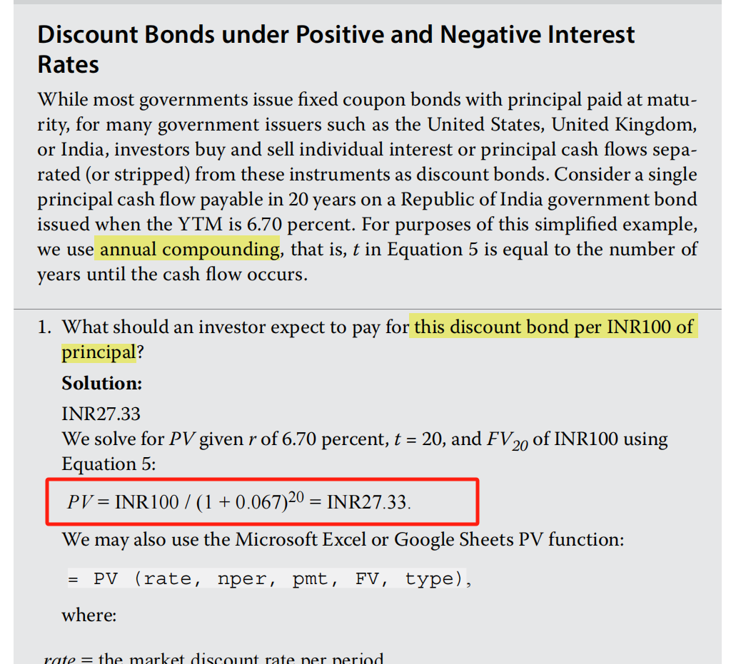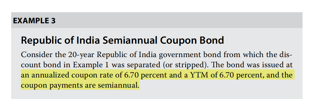 这个题目我们结合上下文看哈,要结合Example 1的例子。用的是这个条件,已知面值100,然后跟你说不同于例题1,现在告诉你说6.7的票息,半年付息,也还是20年,问你这个债券最后一笔payment的折现到t0的价值。