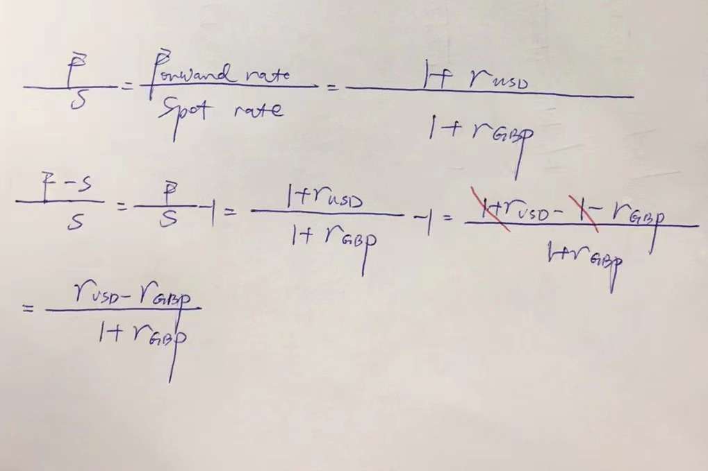 2.(F-S)/S 为什么等于rUSD-rGBP?我的变形步骤如截图所示,哪里错了?