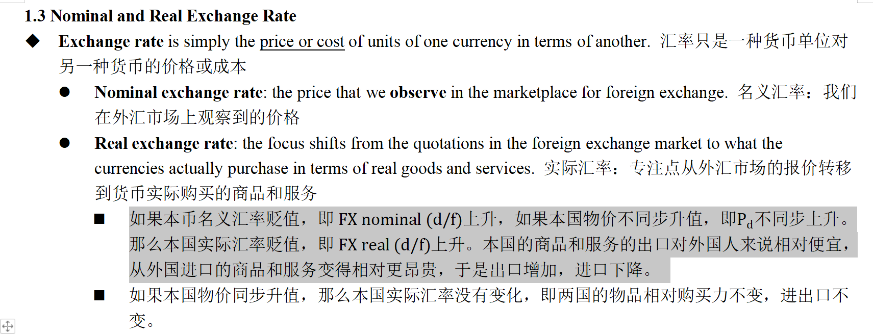 如果本币名义汇率升值,即nominal dc/fc下降,如果本国物价不同步贬值,即Pd不同步下降。那么本国实际汇率升值,即real dc/fc下降。本国的商品和服务的出口对外国人来说相对昂贵,从外国进口的商品和服务变得相对更便宜,于是出口下降,进口增加。