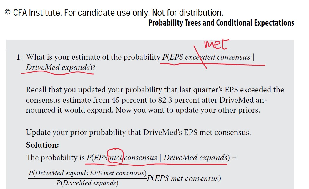 第1问,问的是DriveMed´s EPS met consensus的概率,但是第1问第1行说要估计the probability P (EPS exceeded consensus | DriveMed expands)?