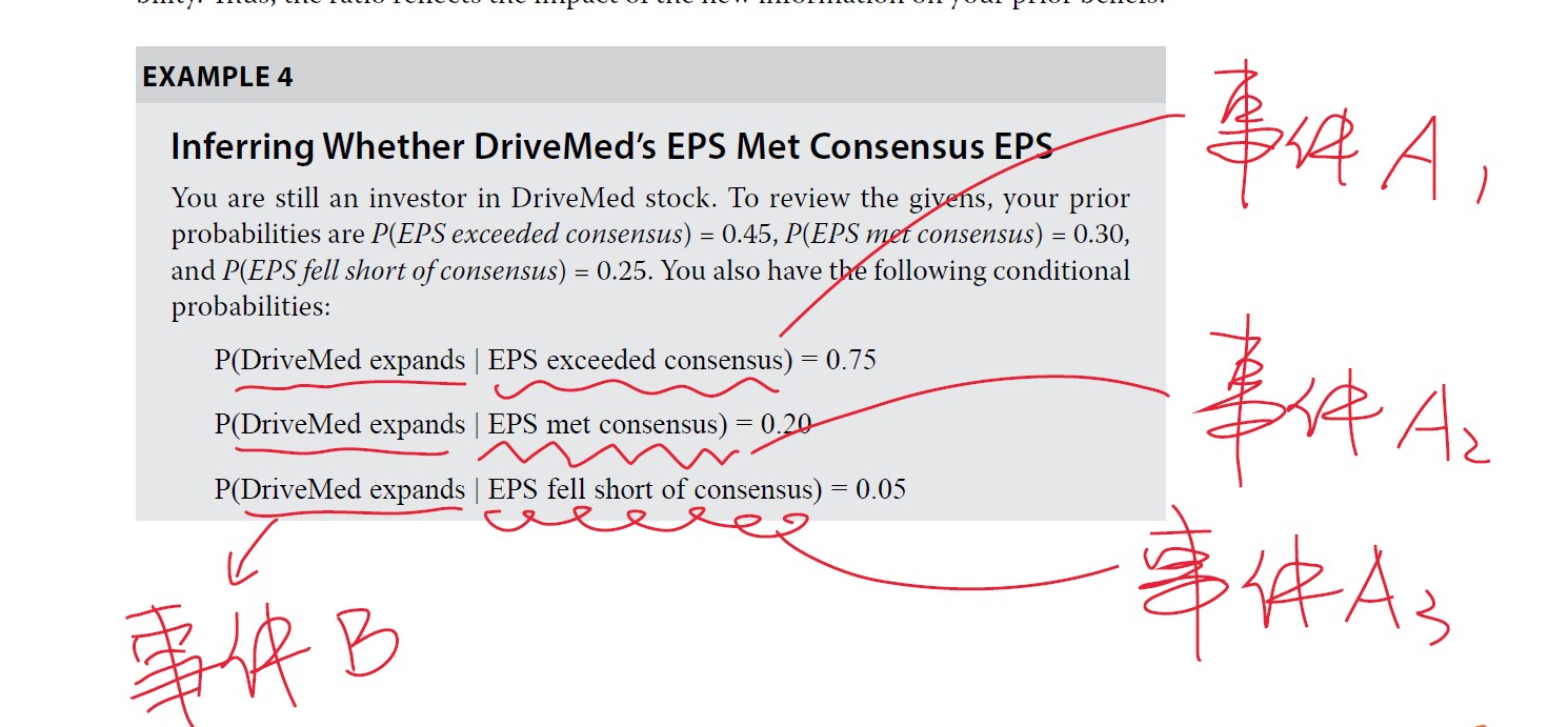 Module 4-书P143-Example 4- https://www.gfedu.cn/home/questiondetail.html?ifTask=1&QuesId=177980&from=1 以这个链接为例,请解析下这道例题的事件A和事件B,分别是什么?4个小问都解析一下。第1问,问的是DriveMed's EPS met consensus的概率,但是第1问第1行说要估计the probability P (EPS exceeded consensus | DriveMed expands)?【补充】上面这个链接中的解析是:假设事件A为EPS小于0,旧信息为P(A~EPS<0)=21% ,此时发生了一个新的事件B,公司声明削减股利,分析师预测P(B~cut div)=24.75%,此时事件B将会影响A事件发生的概率,利用贝叶斯公式可以更新概率P(A)为P(A/B),相当于现在B事件发生的情况下A事件发生的概率,P(A/B)=P(A)*[P(B/A)/P(B)],[P(B/A)/P(B)]称为“信息因子,调整了P(A)