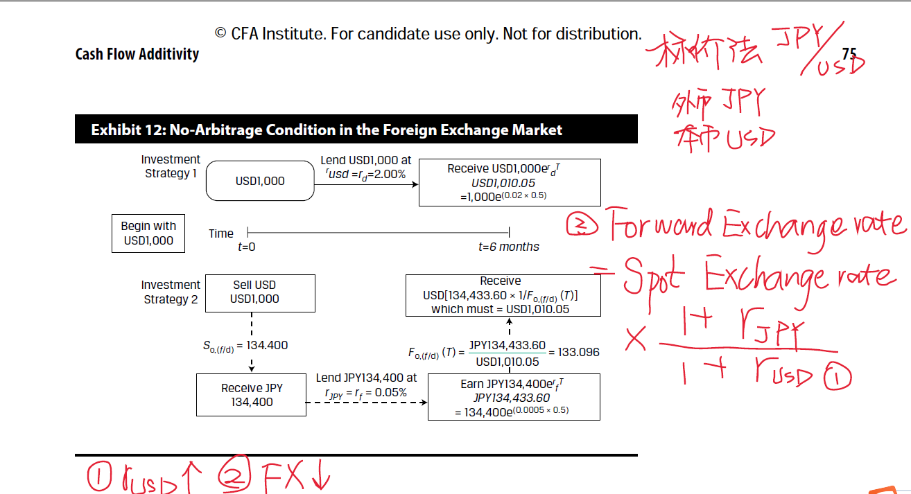 当①USD利率上升,其他条件不变的情况下,②远期汇率下降,说明base currency在未来贬值