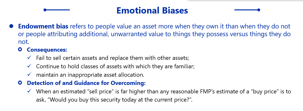 Endowment bias它有个前提,是已经拥有了资产的人会变现出禀赋偏差,when they own,于是在持有资产的前提下不愿意卖,A这个选项和status quo相似