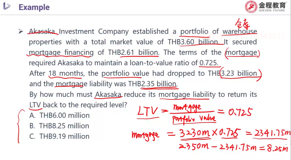LTV是这家公司需要维持的一个状态,portfolio作为抵押物价值跌到了3.23 billion,按照LTV这个比值,公司可以负担的债务应该是:3.23 billion x LTV=2.34175 billion,而此时的负债Mortgage liability 是THB 2.35 billion,所以要降低2.35 billion,达到2.34175 billion
