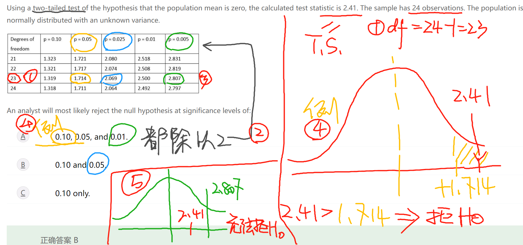 题目选项给出的显著性水平对应不同的查表值,我们以C为例,10%双尾显著性水平,对应单尾面积为5%,对应表格p=0.05这一列,再对应df=23,CV则是1.714,此时CV小于T.S.,于是可以拒绝原假设。