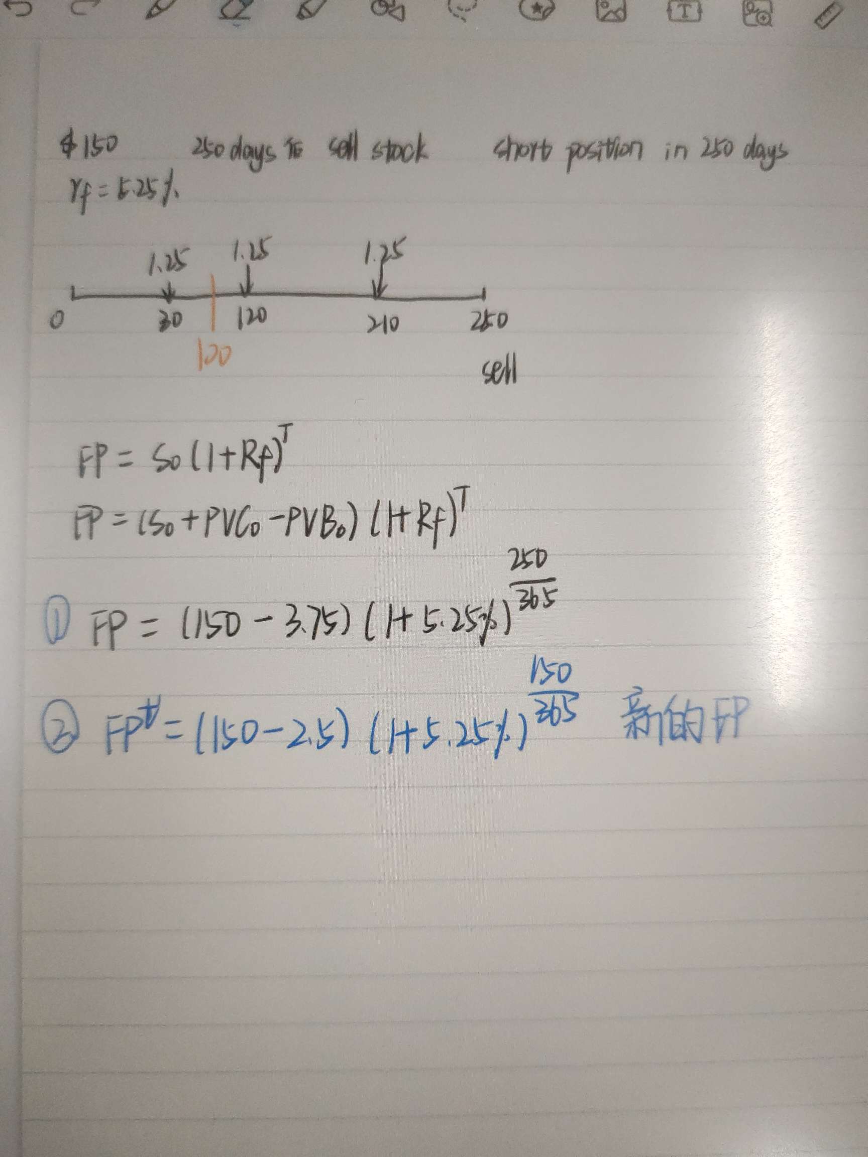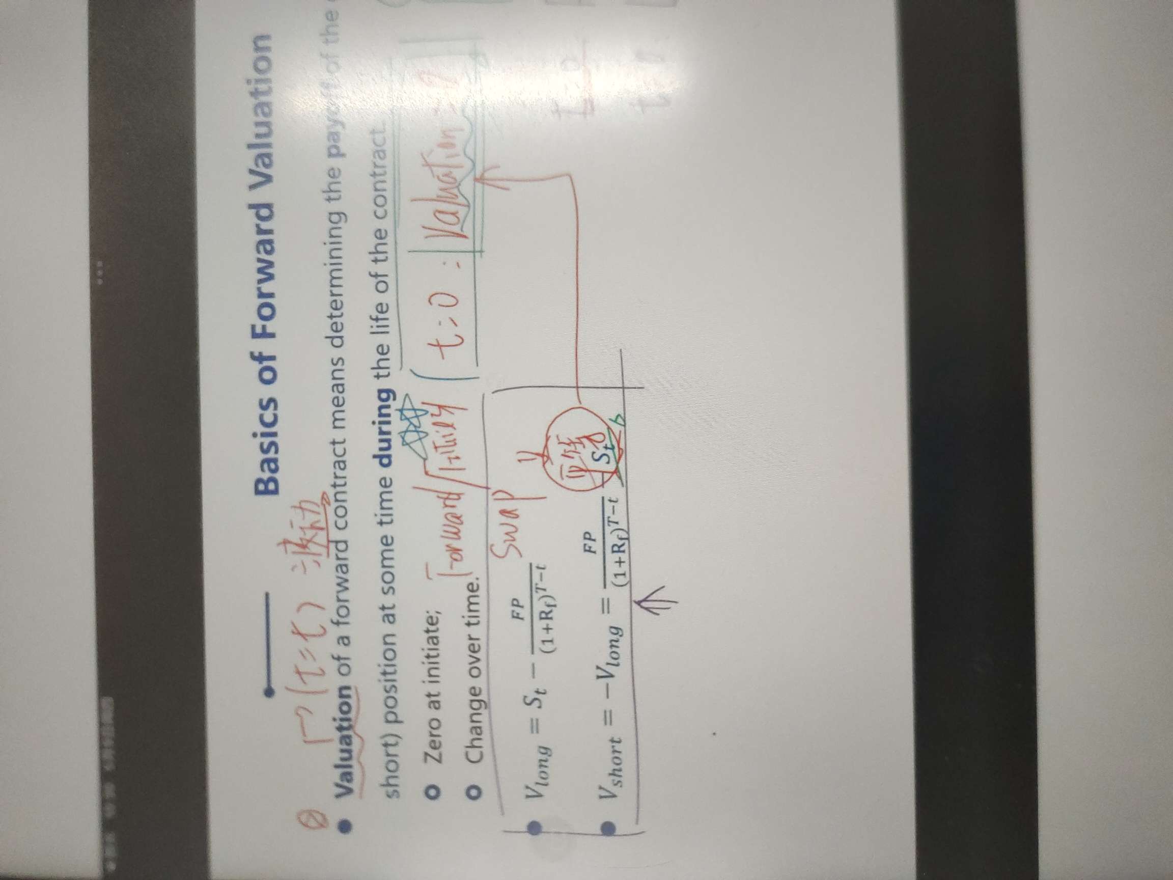 申晨煜同学,你好,首先表扬一下你的做题习惯很好,画图可以让解题更清晰。有两个问题哈,第一,你忘了考虑dividend了,计算FP的时候,公式里应该考虑S0减去PVD,再复利计算、第二,算gian or loss(valuation )的时候,要站在t 时刻,重新计算一个新的FP ,与原来的FP 做差以后再要折现到t 时刻,你忘了折现了。为帮助你理解,我贴一份避坑指南给你哈~