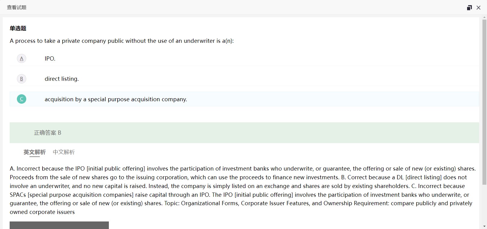 老师,所以只要公司需要上市,就必须要有underwriter的存在是吗?underwriter就是包销的意思?best offering是代销?不是公司上市会在包销或代销中选择一种方式吗?为什么underwriter必会存在呢?我用best offering就不再需要underwriter了不是吗? 对于B选项的direct listing:这种方式可不可以理解为:其实公司实际上并没有上市,这种方法只是让公司的已有股票进入市场流通,流通的总股数不会改变,且这个公司本质上还是一个private公司?