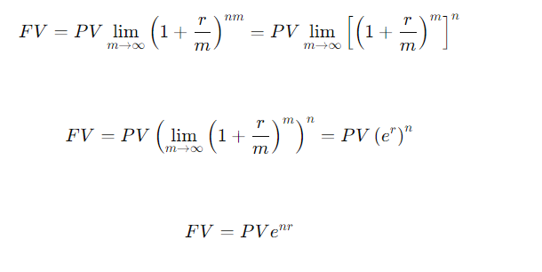 推导公式看下图, r是名义年利率,m是重复的复息的频率。复利次数 m 趋向无穷时,就变成了连续复利。