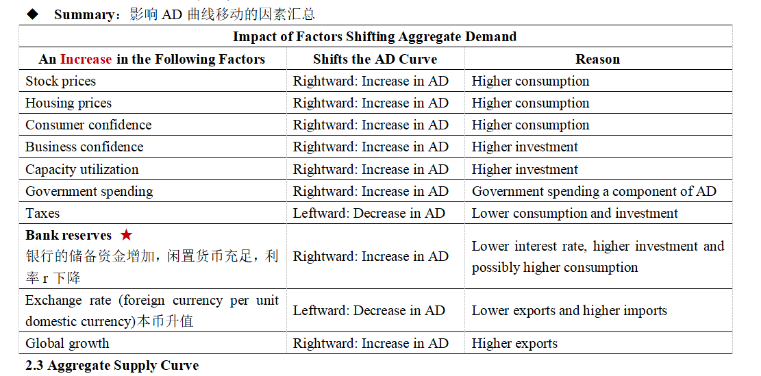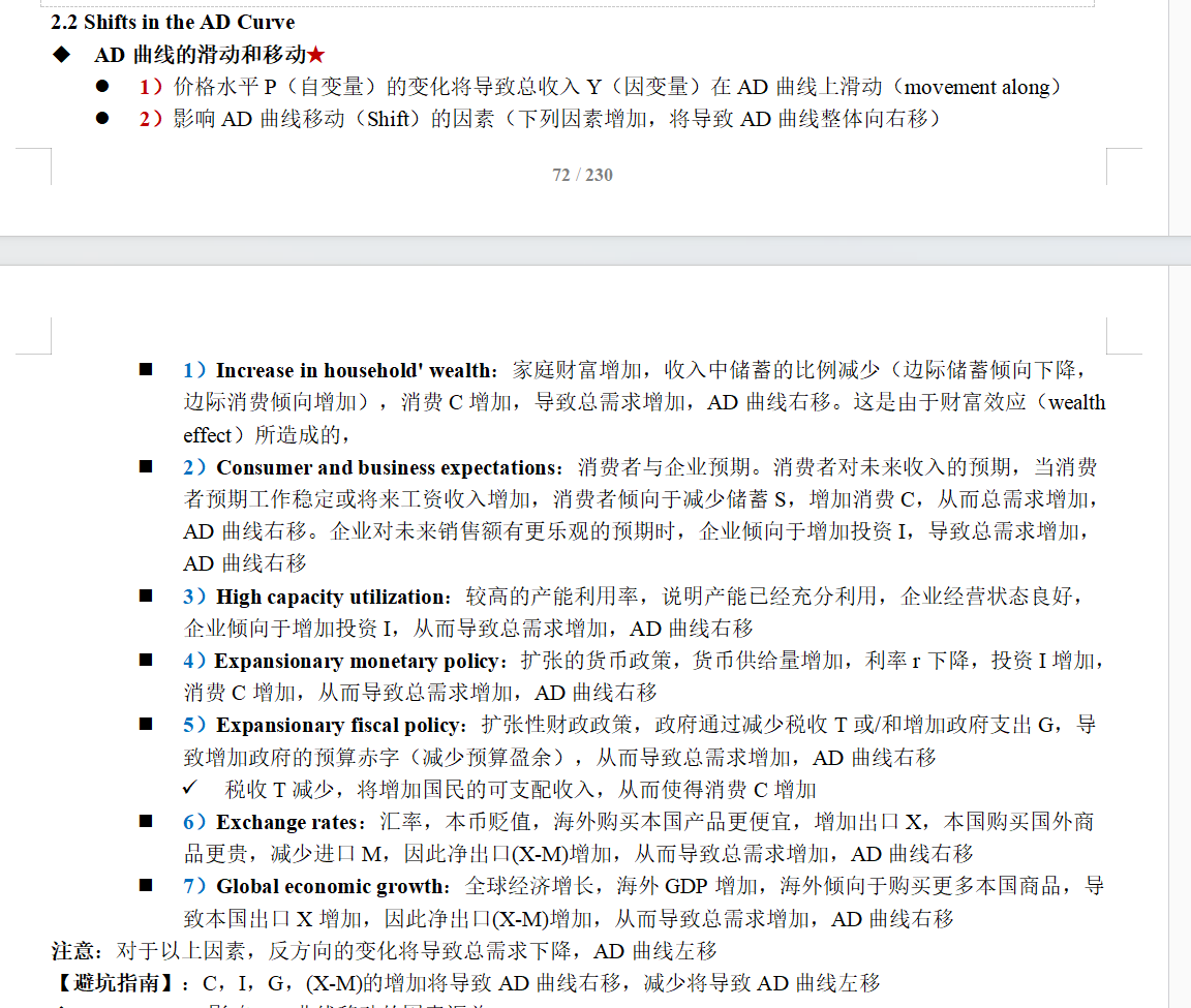 在这里你可以把房价和股价类推解释。因为对未来的收入预期增加,所以买房的人增加导致房价推升,这是未来经济好的表现。当消费者预期工作稳定或将来工资收入增加,消费者倾向于减少储蓄S,增加消费C,从而总需求增加,AD曲线右移。