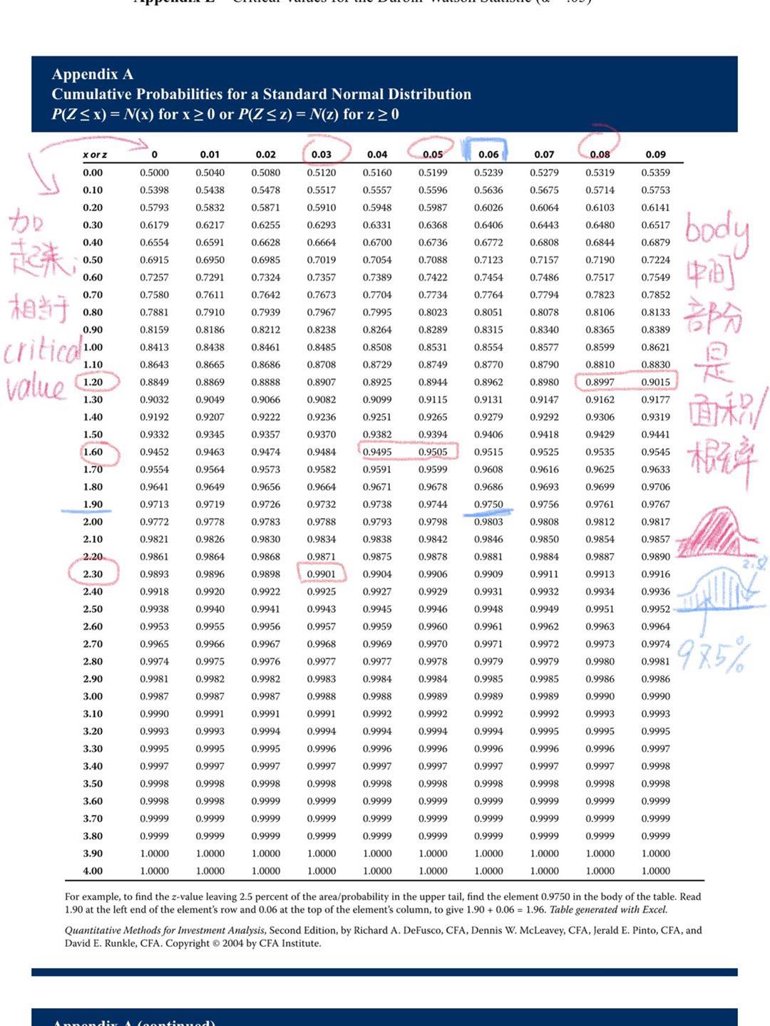 举例说明如何找到想要的概率,比如P(Z<1.96),1.96可以分成1.90+0.06,在表上可以对应到一个数值(附图中的蓝色线),这个值代表图中蓝色阴影部分的面积为97.5%,同时代表了P(Z<1.96)的概率。