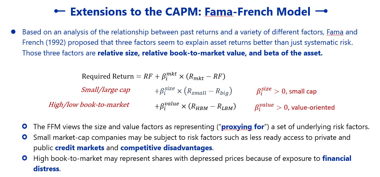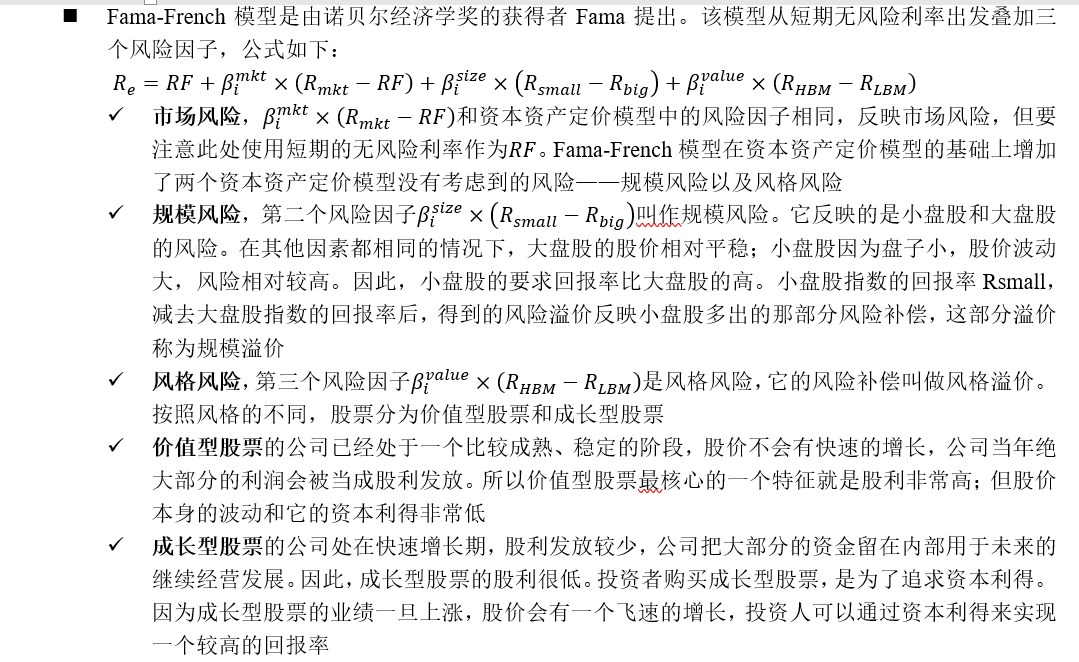 【回复】除了market risk premium作为市场风险的补偿,其余两项都是关于公司的,small or bid指的是公司规模,book value to market value 指的是BV/MV,账面/市值,越高代表公司越偏向价值型公司,越低代表公司越接近成长型公司