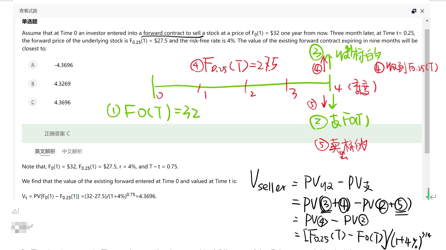 同学,你好,原题如下:Assume that at Time 0 an investor entered into a forward contract to sell a stock at a price of F0(1) = $32 one year from now. Three month later, at Time t= 0.25, the forward price of the underlying stock is F0.25(1) = $27.5 and the risk-free rate is 4%. The value of the existing forward contract expiring in nine months will be closest 。其中: expiring in nine months是用来描述前面这个forward contract的,是说这个还有9个月到期的合约目前的价值是多少?F0(1) 和F0.25(1)都是1时刻年末的价值,因此要往前折9个月,折回现在3个月的时点。