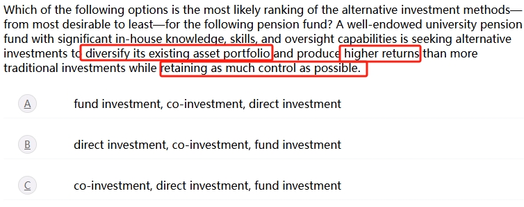 其次,题目要求尽可能保持控制权。直接投资为投资者在投资选择、融资方式和时机方面提供了最大的灵活性和控制权。联合投资者比基金投资者获得更多的控制权,但不如直接投资者。基金投资者的控制权最小;他们的决定仅限于是否投资该基金。因此得出结论。