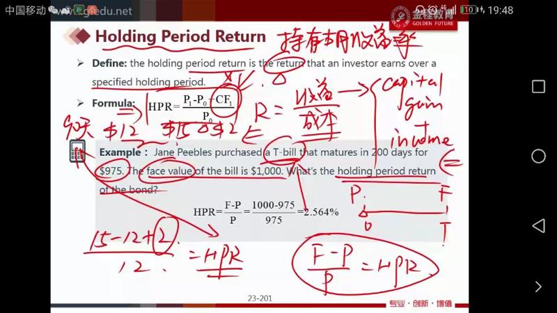 对于T_bill的HPR是不是买的时候就知道多少了,因为F面值不变,买的时候的价值P也知道了,那么不管持有期多久HPR都是一样的??