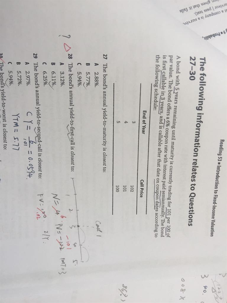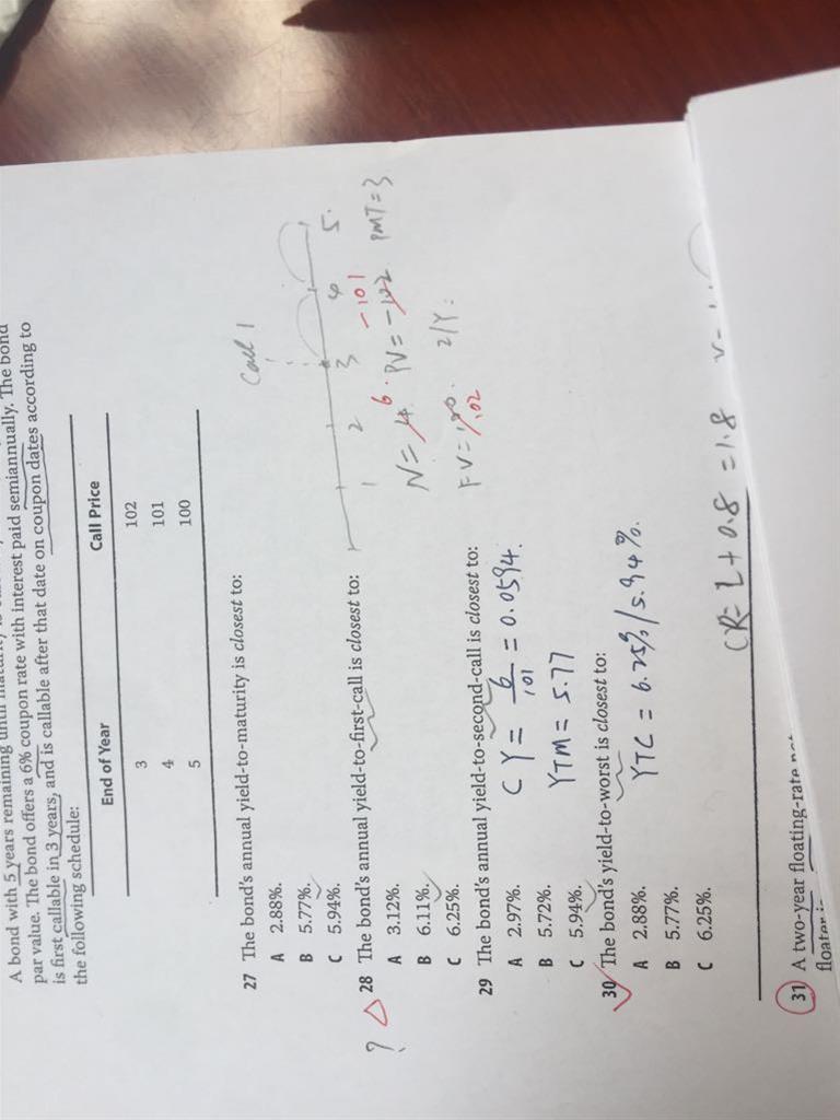 第28题,第一个call day是第三年末的时候吧,那还有2年到期,N应该是4啊,为什么是6呢?而且pv应该是call price-101啊,fv是到期的100啊?