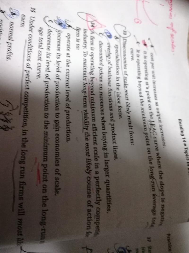 已回答你好,原版书后题第62也第34题,选项C,如果严谨一些,可能要加上the cost,the minimun point of the cost on the long....,因为这个曲线从规模不经济降回到规模经济,数量在减少,但是降到成本最低点时候的数量,