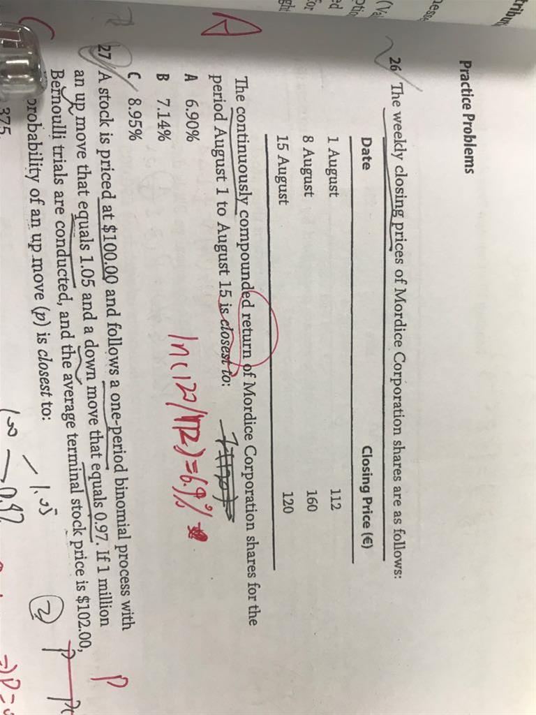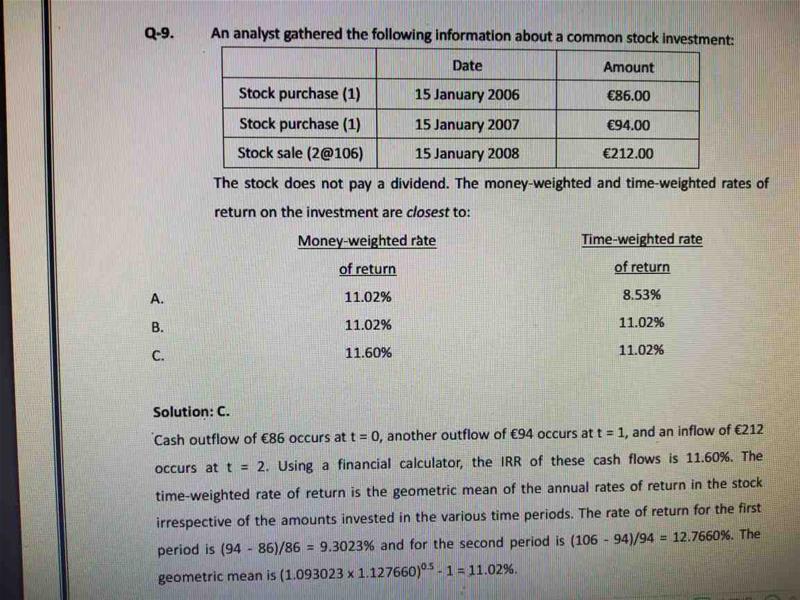 你好,这个是百题里第9题 看了答案 对这个解题有疑问 题目应该是说到,分别是2006.1.15.和2007.1.15,各买进一个股票,2008.1.15两只股票全部卖掉,那这里算时间加权回报,答案里说按照一只股票,分两年内各自回报再求几何平均,但是这个94应该是另外买的一只股票价格,又不是第一只滚到一年后的价格,还有也有两只股票,是一个组合 怎么这里就算一个呢?