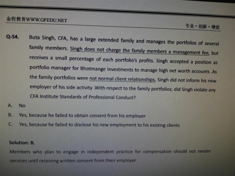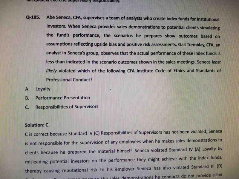 你好,来自百题这里,关于本题,我认为并没违反忠诚(A),忠诚是对雇主的忠诚,即使他提供了资料同实际有一些错误,也只能算工作失误,怎么说是忠诚出问题呢,我们平常在公司上班 也可能会有一些工作失误,也不是故意的失误,公司也不会认为对老板不忠诚吧?,本题说选C,说他虽然是主管,但是这些资料是他自己准备的,并不是下属准备的,所以现在资料错误了,也不是他监管不到位的责任吧,是不是这样理解的?