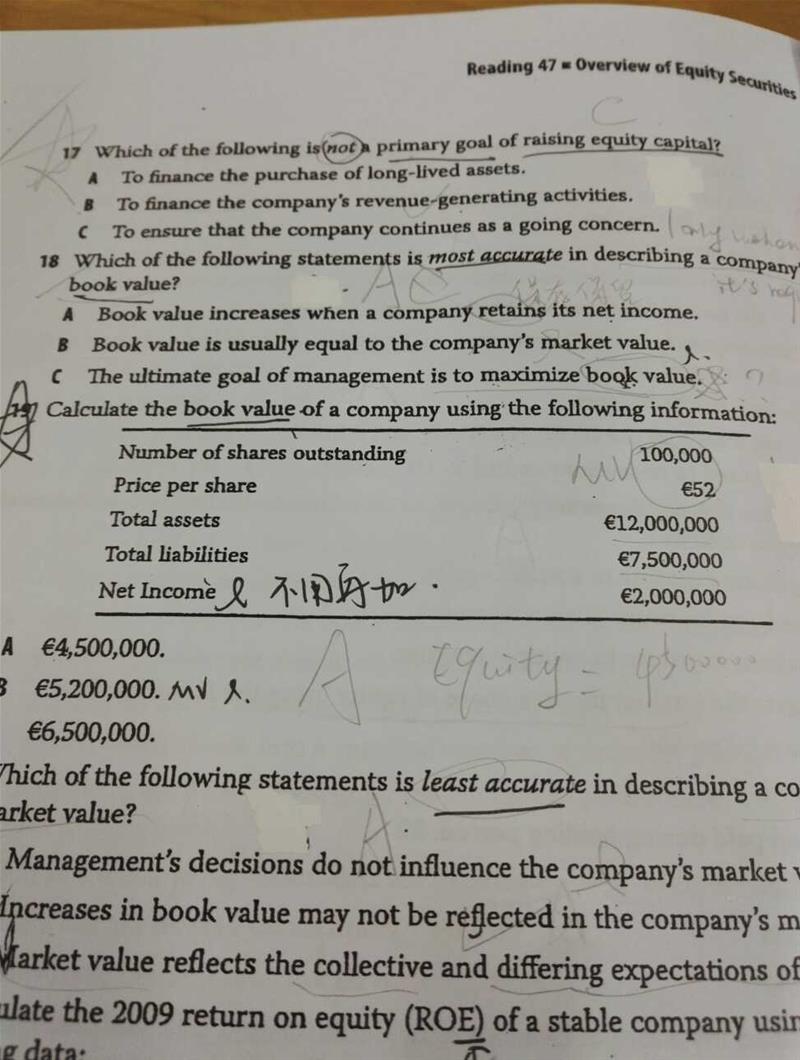 18题C是对的吗, 是否可以理解为BV是账面上的价值A-L,就是equity,而MV是投资者对公司的预期价值,两者角度不同。