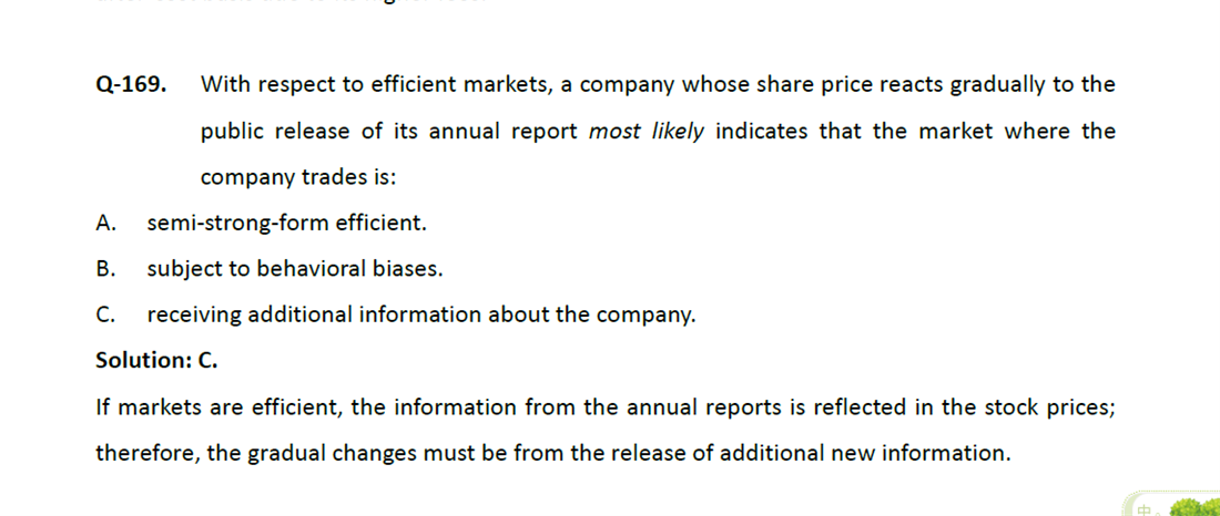 题目是不是问:市场逐渐的反应出来年报发布的影响, 1、没有快速反应所有的公开信息,说明半强不有效,所以不选A 2、那就是有行为心理学方面的偏差,所以应该选B啊 3、C是市场有关于这个公司的其他信息,不明白为啥选C