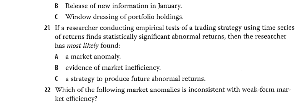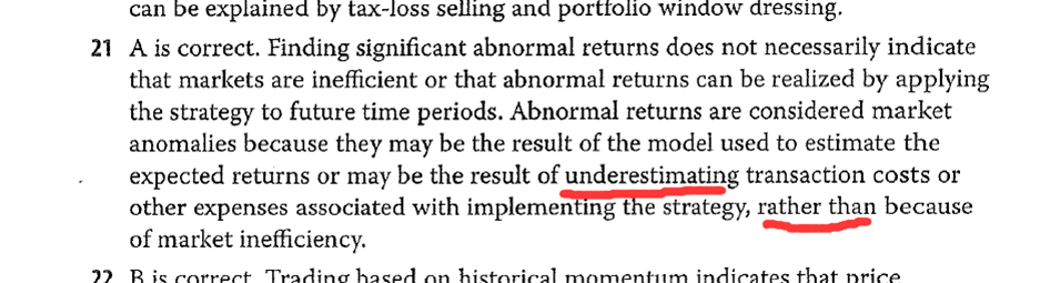 如果研究者用历史数据发现一个可以获得超额收益的策略,那么这个研究者为什么不是发现了市场的无效性?解答说的,可能是低估了交易成本和实施策略的成本,而并非策略真正有效,所以不选B。我怎么感觉解释很扯,又没有说研究者的策略里含不含成本啊。