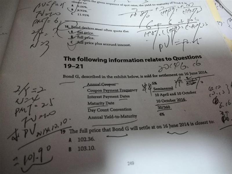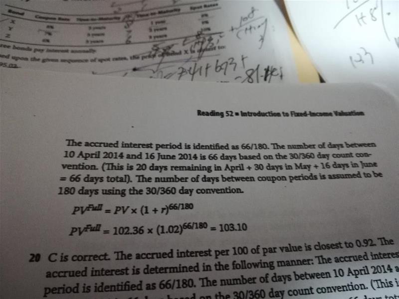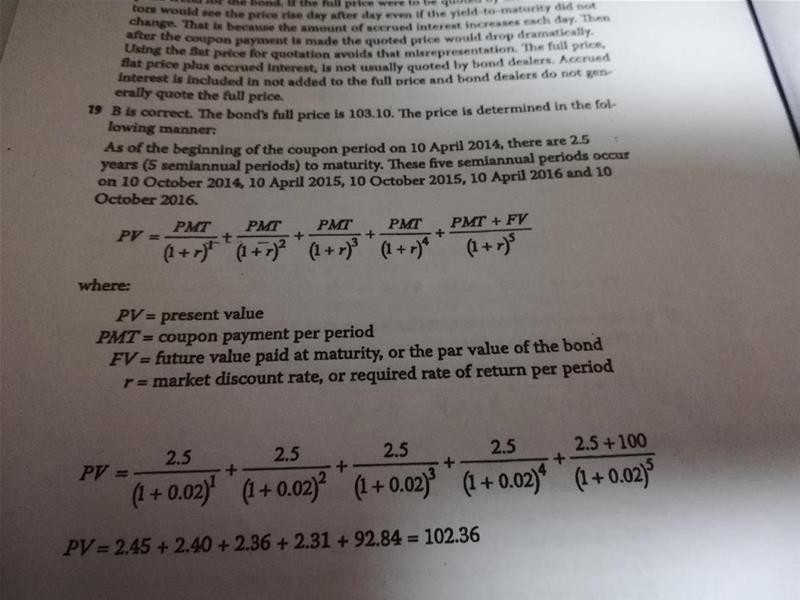 你好 关于原版书后题第249页第19题, 我认为题目里面提到债券G是2014年6月16日才卖出(是不是等同于这个时候才发行呢),那这个题目,要求2014年6月16日发行时候的估价,那为什么可以计算2014年4月10日的价格呢(原题是根据先算出2014.4.10价格 然后再以这个基础上滚到去算2014.6月16日,合计再算从2014年4月10日再推后66天后的价格),我的问题有两个:1.那个时候(2014.4.10)都还没有发行 ,发行日是2014.6.16,怎么可以2014.4.10算了第一次计息时间呢? 2,能不能按照第一次计息为2014.10.10,根据N为4,I/Y为2,PMT为2.5,FV为100算出P(2014.10.10)为101.9,然后再往前推,是往前推114天(从2014.6.16-2014.10.10合计114天)算2014.6.16的价格,是否可以?,如果可以的话 这个114天倒回来是否也可以,PV(FULL)就是,2014.10.10的101.9, 根据公式变形下,PV(2014.6.16)=101.9/(1+0.02 )的116/180次方 ,但是答案是100.6不对?,不知道为什么不能以2014.10.10算第一次分红这样算呢?