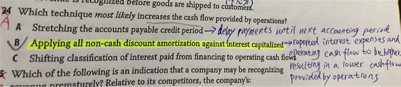 老师,选项A delay payments不应该减少现金流吗? 选项B中文是什么意思?以及答案说报告的利息费用和operating现金流高,所以operations现金流减小是什么意思呢?