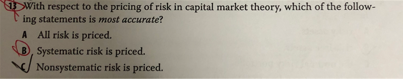 老师你好,麻烦讲解下这两道题,我不理解第13题,capital market theory不是定价非系统风险的吗?