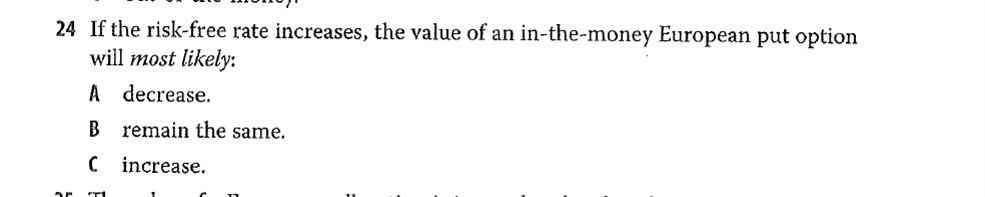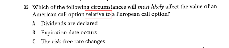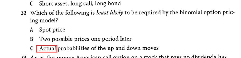 1、这道题选C的原因是不是Actual确定的概率吧? 2、但是二叉树计算option也不需要spot price啊。公式是根据E(R)=πu(u-1)+πu(d-1),πu和πu分别是上涨、下跌的价格,u和d是上涨下跌的概率。没有spot price啊。不知道我的公式理解是不是对的?