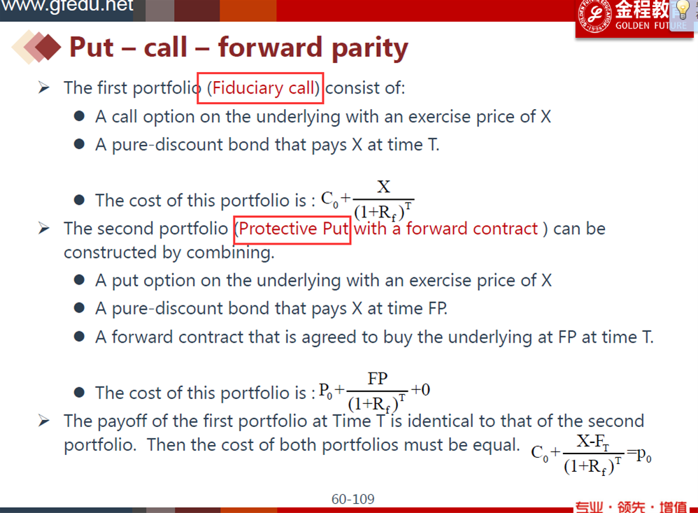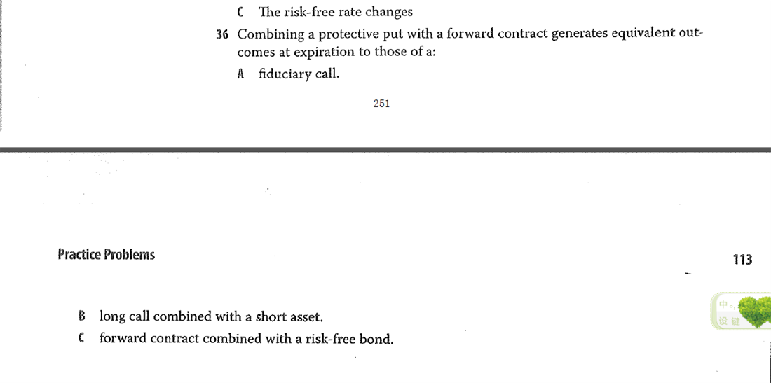 put-call-forward parity基础班的视频讲得比较略,没有太听懂。 1、是不是就是把ck=ps中的股票S一项换成该项underlying asset的股票对应的了forward price了? 2、ficduciary call和protective put有什么意义啊? 3、这道里面里是说P+FP等价于什么?应该等价于C+PVX啊,为啥答案是A,直接等价了C,那债券部分呢?