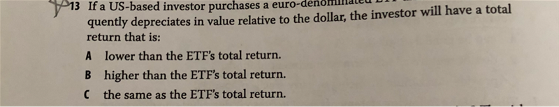 老师这道题,欧元贬值那不就意味着美元升值,那us-based investor 的return不是应该高才对吗?答案是A,我选的B