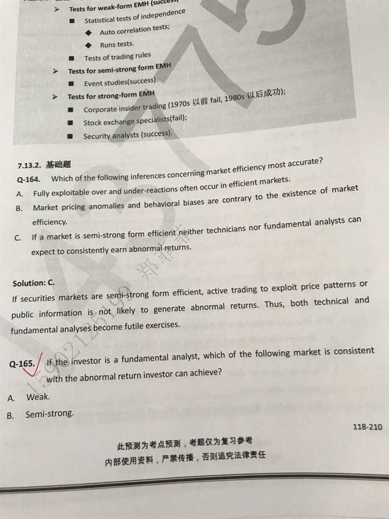 查看试题 已回答老师165题,请问上课时候说在semi strong下fundamental 和technicalbanalysis都不能imply market efficiency,weak form下是technical 不能reflect对吗?那为什么这一题选A?什么叫achieve abnormal return?跟这三种market efficiency有什么关系?可以解释一下吗?上课讲的有点懵